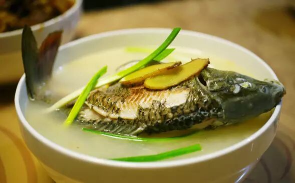 鲤鱼去杂洗净切小块,葱、姜拍破。将鲤鱼、荜拨、葱、姜放入锅内,加水适量,旺火烧开,小火焖煮40分钟,放入料酒、醋、味精、香菜。